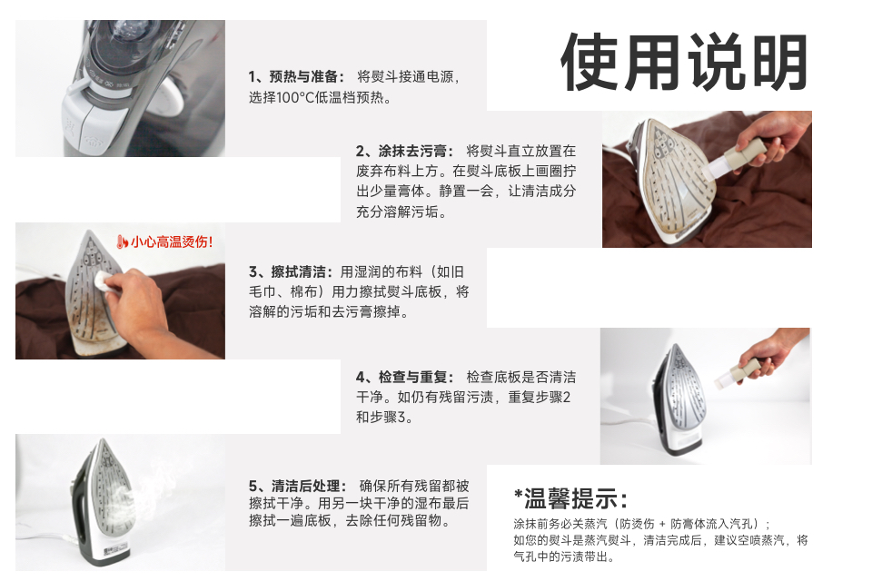 1. 成分安全温和:,避免对熨斗底板造成腐蚀或刮伤,同时确保使用后无异味、易清理。